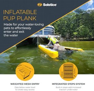 The Solstice Original Inflatable Pup Plank is a floating ramp ladder designed for dogs up to 220 pounds, making it a solid choice for larger pets. It's made from UV-resistant PVC and features a claw-friendly EVA traction pad, ensuring durability and comfort. The step design incorporates an integrated steel-bar weighted mesh that sinks below water level, making it easier for pets to climb in and out of the water. Additionally, the BOOST model adds a second step or bolster for added stability, which is beneficial for higher platforms like docks or boats.
